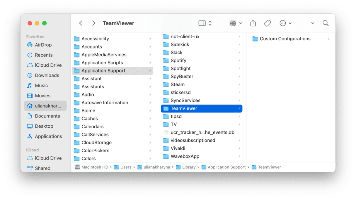 - W polu tekstowym wpisz każdą z tych ścieżek, naciskając po każdej z nich klawisz Return, aby przejść do folderu. Następnie poszukaj plików zawierających TeamViewer w nazwie i przeciągnij je do Kosza: