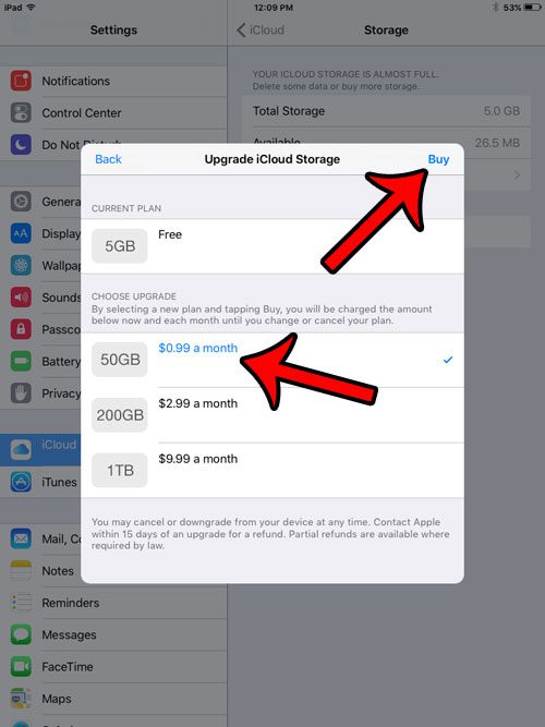 Krok 5: Wybierz opcję przechowywania, do której chcesz dokonać aktualizacji, a następnie dotknij niebieskiegoKupićw prawym górnym rogu wyskakującego okna.