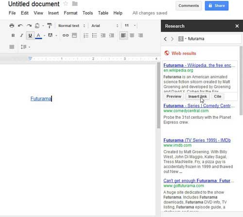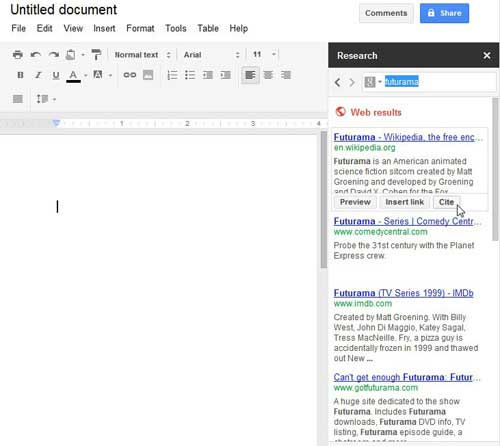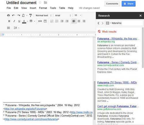 Na szczęście Google dodał nową funkcję do swoich stron Dokumentów o nazwieBadaniaktóry umożliwia przeszukiwanie Internetu bezpośrednio ze strony dokumentu.