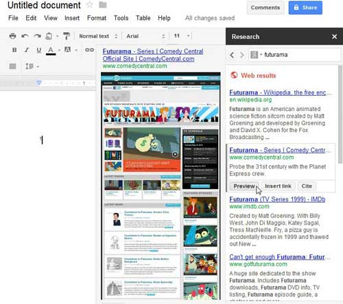 Na koniec, jeśli kliknieszZapowiedźprzycisk, podgląd strony wyników wyszukiwania zostanie wyświetlony po lewej stronie narzędzia Badania, umożliwiając wyświetlenie podglądu strony wyników bez opuszczania dokumentu.