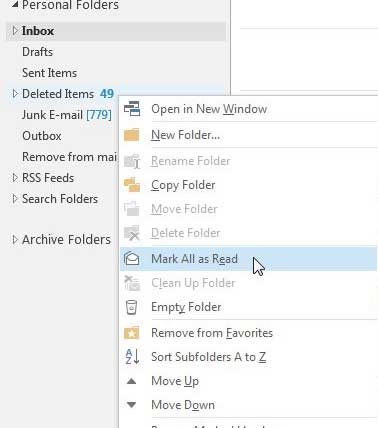 Na szczęście w Outlooku 2013 możesz z łatwością oznaczyć cały folder jako przeczytany, co oznacza, że nie musisz klikać każdej wiadomości osobno.