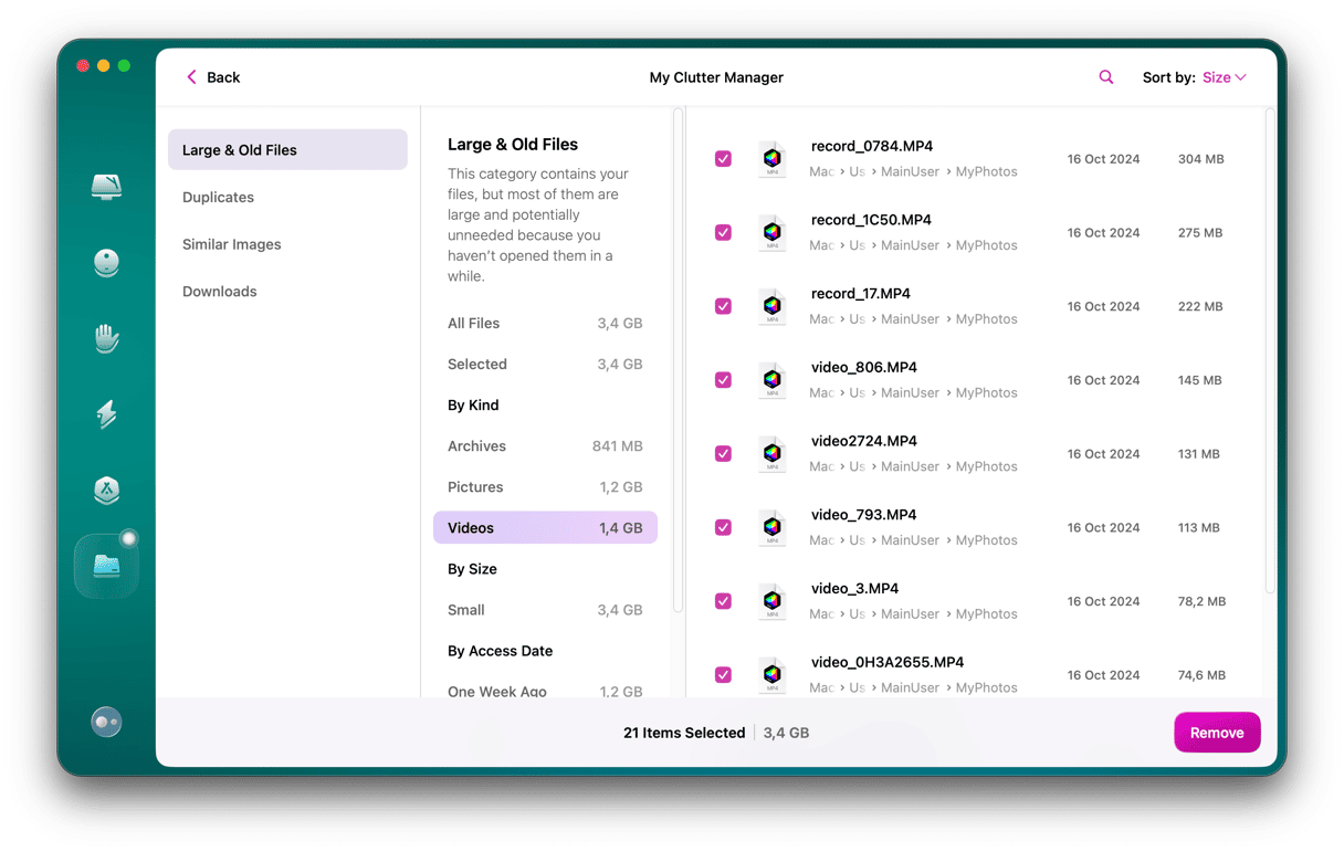 Aplikacja posiada intuicyjny moduł Duże i stare pliki, który skanuje całe urządzenie, automatycznie kategoryzując pliki i foldery według rodzaju, rozmiaru i daty ostatniego dostępu. Teraz możesz nie tylko łatwo wizualizować, ale także znajdować i usuwać niepotrzebne pliki, aby zaoszczędzić miejsce na dysku i uporządkować komputer Mac.
