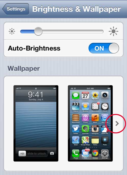 Otwórz menu Jasność i tapetaKrok 3: Kliknij strzałkę po prawej stronieTapetasekcja.