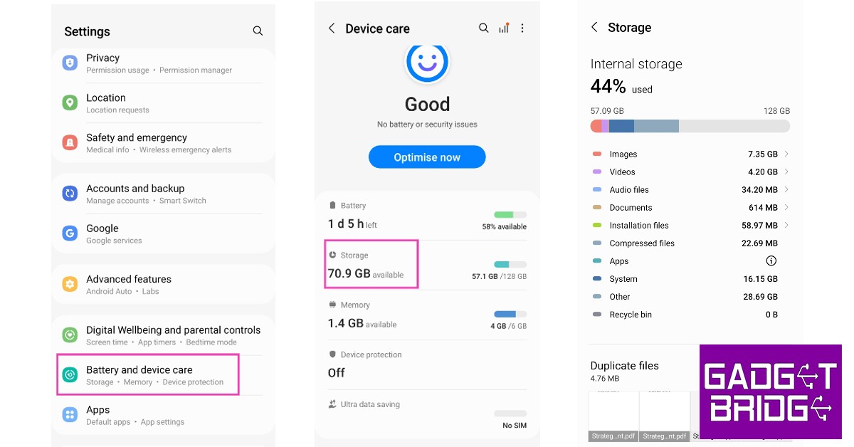 Jeśli wkrótce osiągniesz maksymalny potencjał pamięci telefonu, być może zauważyłeś już spadek wydajności. Czasami może to również prowadzić do losowego wyłączania się telefonu, ponieważ pamięć RAM nie jest w stanie obsłużyć wszystkich powierzonych jej zadań. Dobrym pomysłem jest pozostawienie 20-30% wolnej przestrzeni w pamięci telefonu. Idź doUstawienia>Pielęgnacja baterii i urządzenia>Pamięćdo zarządzania pamięcią smartfona. W tym miejscu zobaczysz rozkład pamięci wewnętrznej telefonu i dowiesz się, które aplikacje zajmują najwięcej miejsca w telefonie. Aby zwolnić miejsce, usuń wszystkie zduplikowane pliki z telefonu i odinstaluj nieużywane aplikacje.