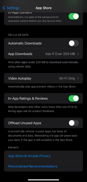 Krok 2:Włącz przełącznik dla przełącznika dlaAktualizacje aplikacji. WDane komórkowesekcja, wyłącz przełącznik dla przełącznika dlaAutomatyczne pobierania.