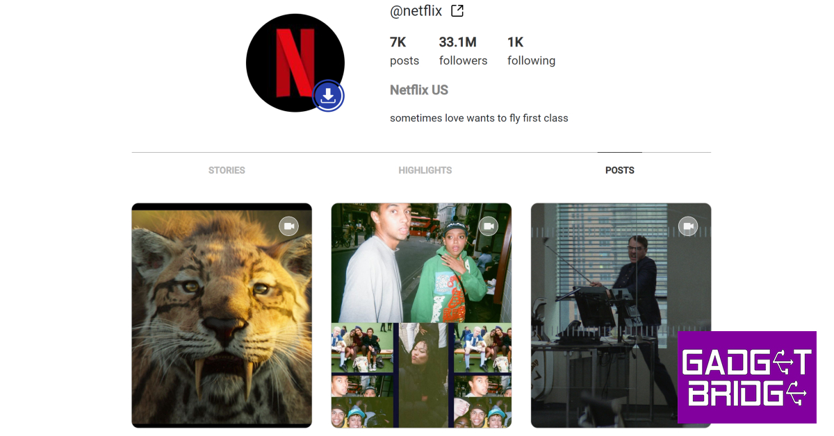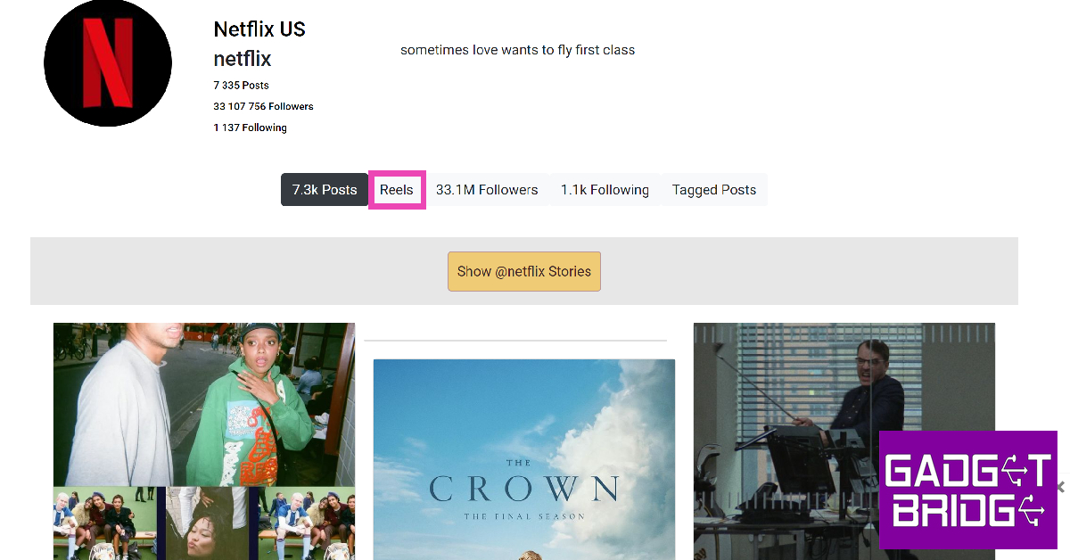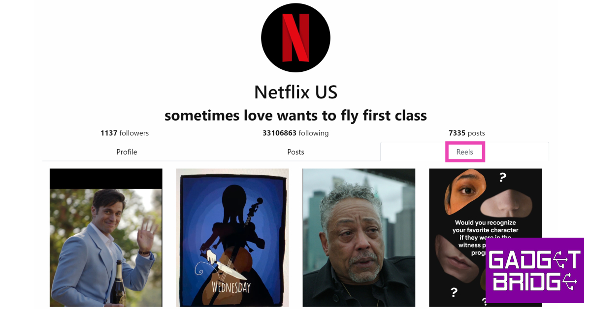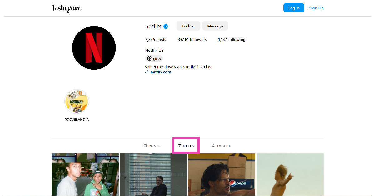 Witryna Instagrama na PC umożliwia przeglądanie postów i oglądanie Reels bez konieczności logowania się na konto. Treści zamieszczane na profilach publicznych mogą przeglądać także użytkownicy, którzy nie zarejestrowali się na platformie. Aby wyświetlić szpule z określonego konta,dodaj jego nazwę użytkownika do adresu URL Instagramai naciśnij „Enter”. Na przykład, jeśli chcesz wyświetlić Reels opublikowane przez Netflix, wpiszhttps://www.instagram.com/netflix/w polu adresu URL i naciśnijWchodzić. Po wejściu na profil przejdź do zakładki Reels, aby zobaczyć w jednym miejscu wszystkie Reels opublikowane przez konto.