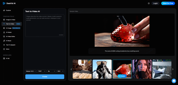 DeeVid AI jest przeznaczony do tworzenia realistycznych filmów AI, w tym scen całowania. Intuicyjny edytor pozwala użytkownikom szybko generować filmy bez zaawansowanych umiejętności edycji.