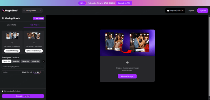 MagicShot AI jest przeznaczony do tworzenia romantycznych i zabawnych filmów AI. Obsługuje generowane przez sztuczną inteligencję sceny całowania z realistyczną mimiką.