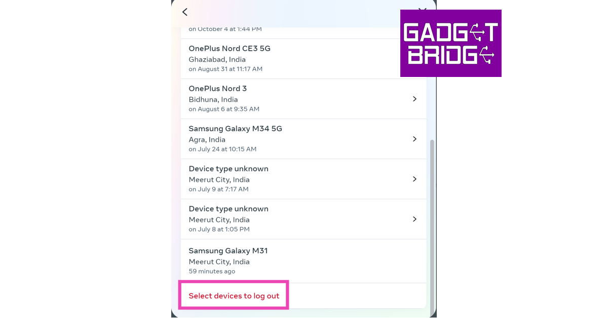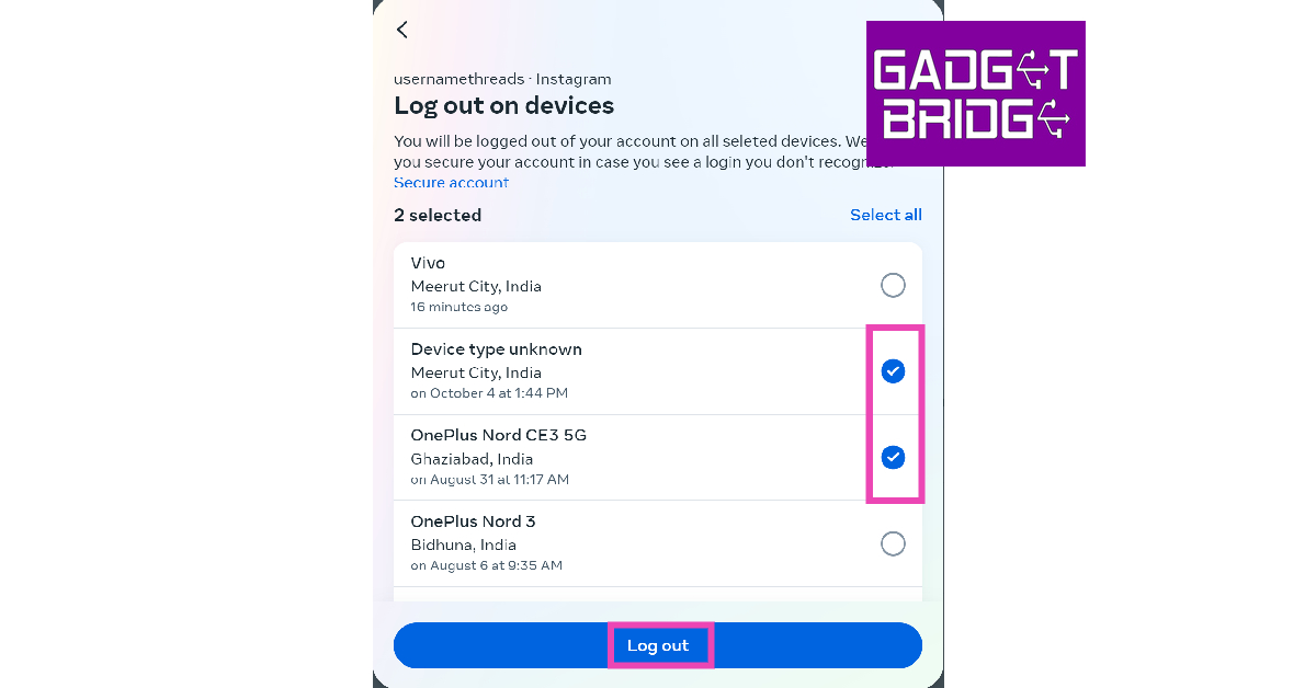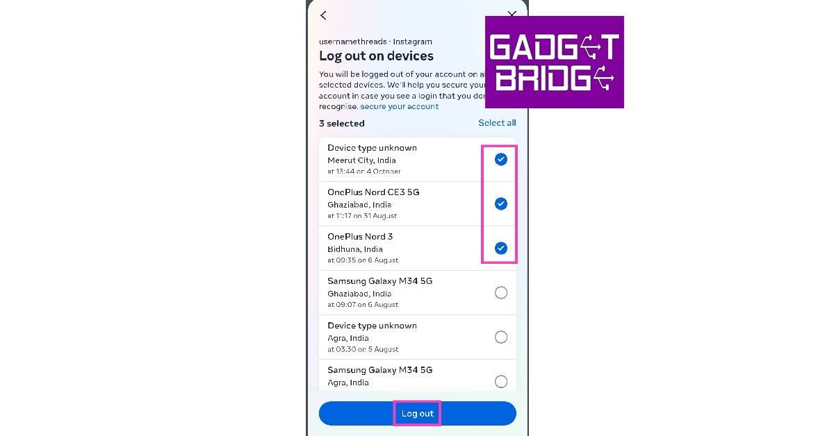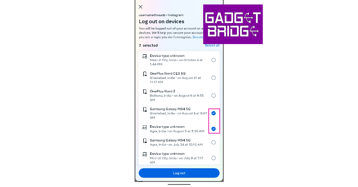 Krok 7:Kliknij urządzenie(a), które chcesz usunąć ze swojego konta na Instagramie i naciśnijWyloguj się.