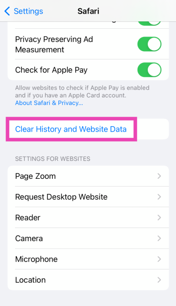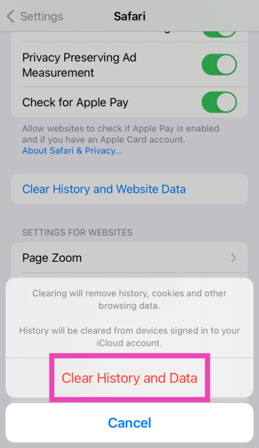 Idź doUstawienia>Safarii dotknij opcji Wyczyść historię i dane witryny, aby wyczyścić pamięć podręczną przeglądarki.