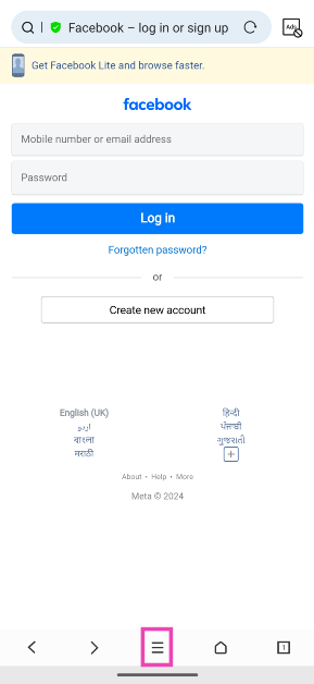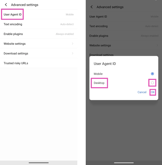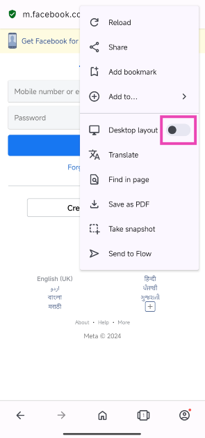 Załaduj stronę w przeglądarce, naciśnij ikonę menu hamburgera na dole, przejdź doUstawienia>Ustawienia zaawansowane>Identyfikator agenta użytkownikai wybierz Pulpit.