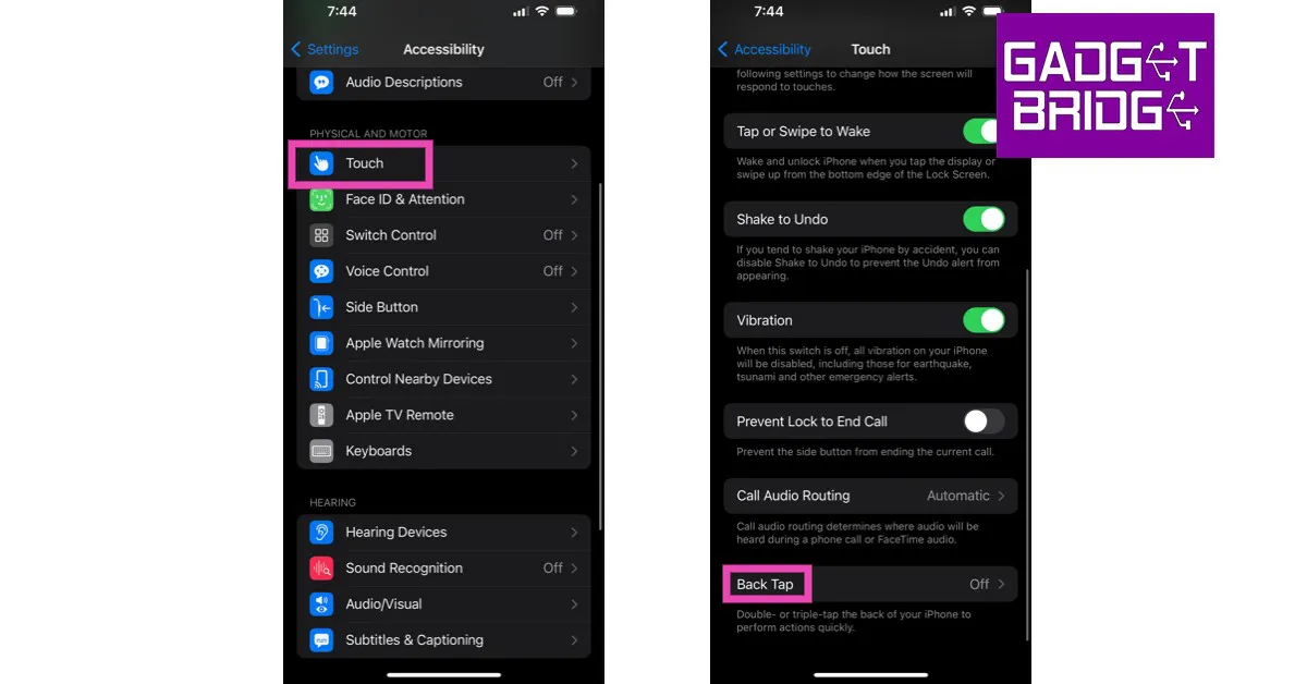 Krok 2:Wybierz opcję Dotknij i dotknij „Dotknięcie wstecz”.