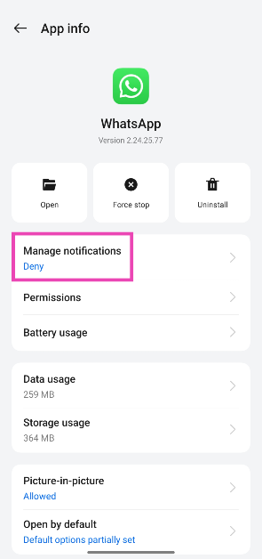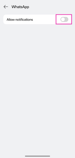 Idź doUstawienia>Aplikacje>WhatsApp>Zarządzaj powiadomieniamii włącz przełącznik obok opcji „Zezwalaj na powiadomienia”.