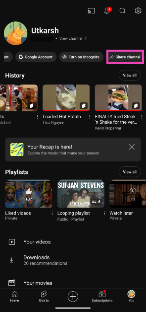 Krok 3:Przewiń opcje poniżej nazwy profilu i wybierzUdostępnij kanał.