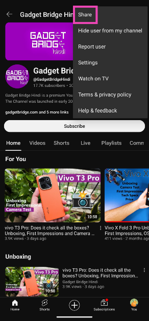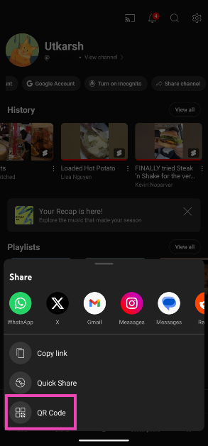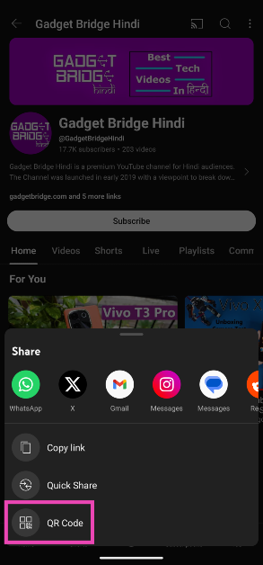 Przejdź do YouTube, wybierzTy>Udostępnij kanał>Kod QRi zapisz kod na swoim telefonie.