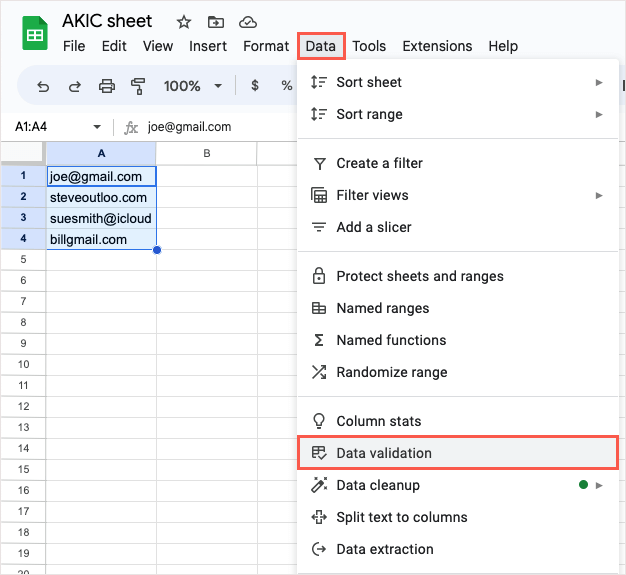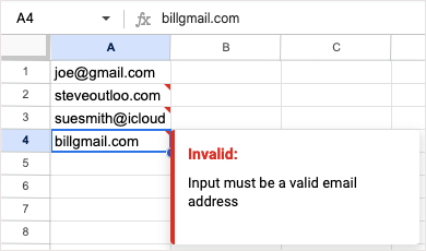Якщо у вас є електронна таблиця, яка містить адреси електронної пошти, будь то Gmail, Outlook чи щось інше, ви можете переконатися, що вони дійсні. Хоча Таблиці не показують, чи адреса є законною, вони показують, чи правильно вона відформатована за допомогою символу @ (At) і домену.
