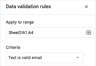 - Коли відкриється бічна панель «Правила перевірки даних», виберітьДодайте правило, підтвердьте або налаштуйте клітинки вЗастосувати до діапазонуполе та виберітьТекст є дійсною електронною поштоюу спадному списку Критерії.