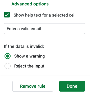 - За бажанням виберіть Додаткові параметри, такі як відображення тексту довідки, відображення попередження або відхилення введення. ВиберітьГотовощоб зберегти та застосувати правило перевірки.