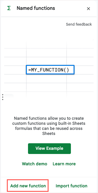 - На бічній панелі «Іменовані функції», що відкриється, використовуйтеДодати нову функціювнизу, щоб створити власну функцію. Ви також можете переглянути приклад, переглянути демонстрацію або дізнатися більше про функцію.