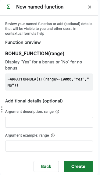 - Перегляньте попередній перегляд функції та виберіть будь-яку з нихНазадвнести зміни абоСтворитищоб зберегти нову функцію. Зауважте, що ви також можете додати додаткові аргументи, якщо це необхідно.