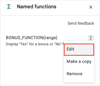 Якщо потрібно внести зміни, знову відкрийте бічну панель «Іменовані функції», виберітьтри крапкиправоруч від функції та виберітьРедагувати.