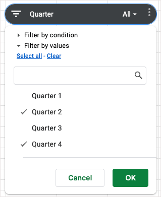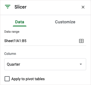 Коли відкриється бічна панель, відкрийтеДаніпідтвердьте діапазон даних угорі, а потім виберіть стовпець для використання для фільтра.