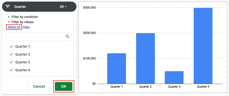 Щоб повернути діаграму до початкового вигляду з усіма даними, відкрийте фільтр і виберітьВибрати все>добре.