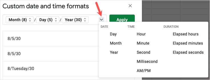 - Коли закінчите, виберітьЗастосуватищоб використовувати спеціальний формат дати й часу, і ви побачите оновлення аркуша.