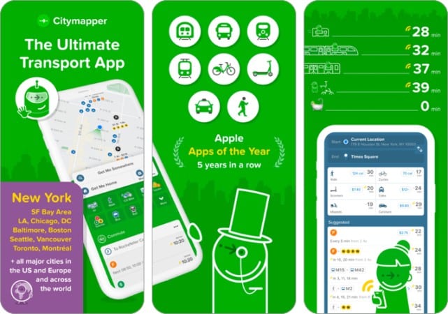 Крім того, програма пропонує три різні види карт, офіційні офлайн-карти та сповіщення про заборону паркування. Таким чином, ця програма стане вашим супутником у подорожах, якщо ви живете в Нью-Йорку або в районі затоки Сан-Франциско. Крім того, ви можете порівняти ціни на таксі, забронювати автомобіль напрокат або знайти електросамокат поблизу завдяки його інтеграції з додатками для оренди велосипедів і автомобілів.