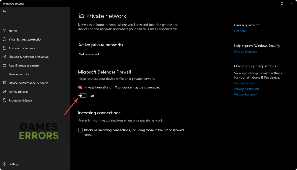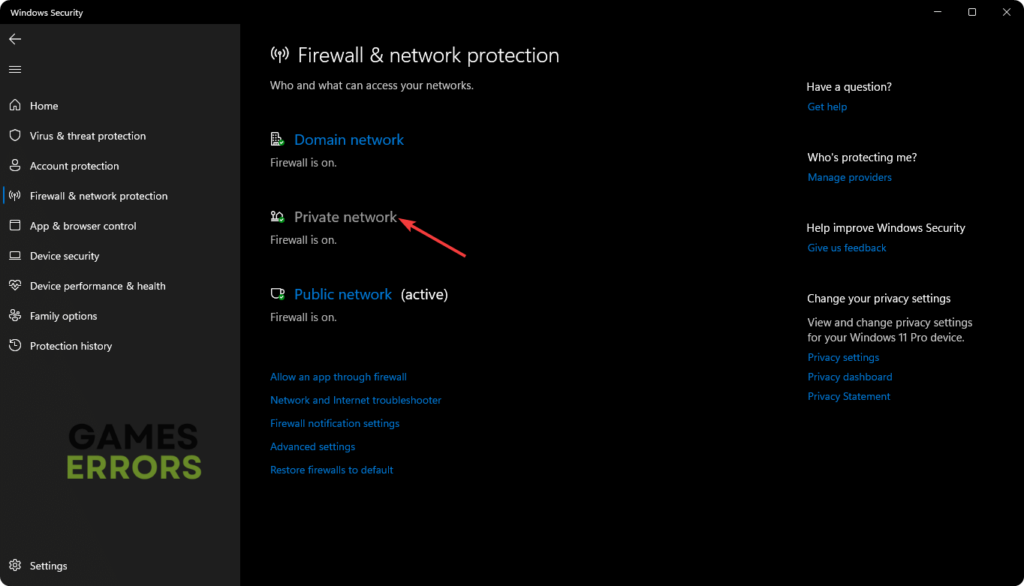 1. Перейдіть доБрандмауер і захист мережіз бічної панелі.