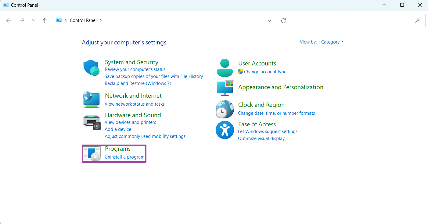 - ВідкрийтеПанель управлінняі натисніть наПрограми.