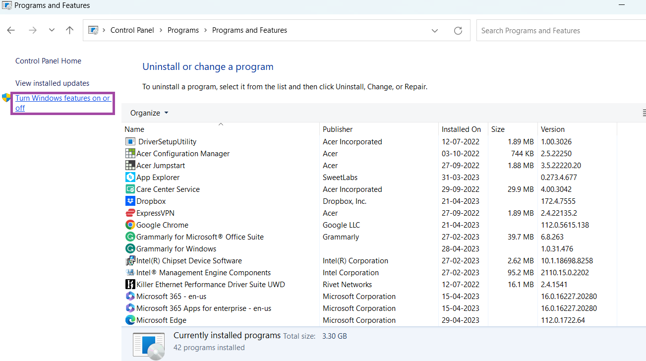 - Натисніть наУвімкнення та вимкнення функцій Windows.