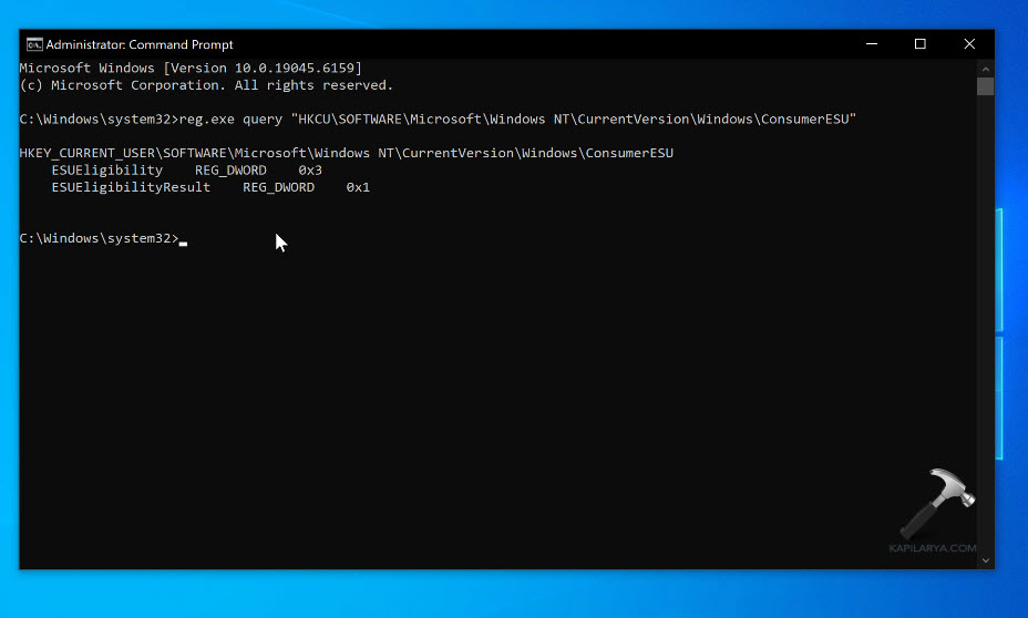 reg.exe query "HKCUSOFTWAREMicrosoftWindows NTCurrentVersionWindowsConsumerESU"
