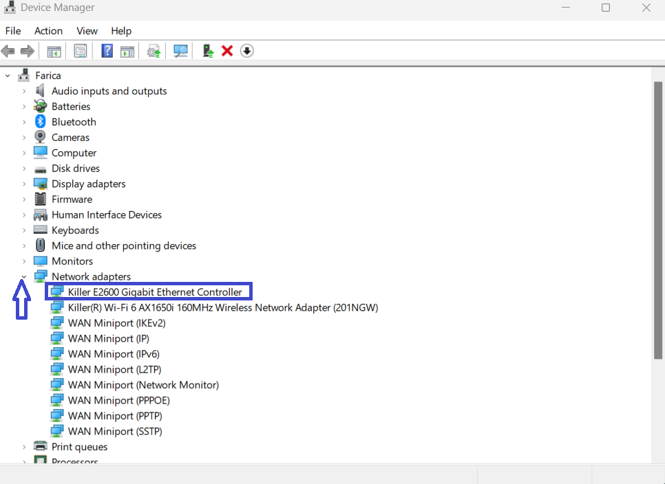 - Далі розгорнітьМережеві адаптеринатиснувши стрілку поруч із нею.