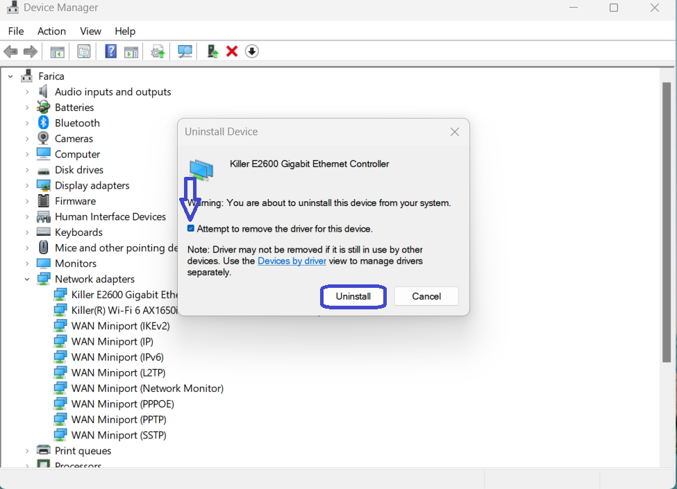 - Тепер поставте прапорецьСпробуйте видалити драйвер для цього пристрою. Потім натиснітьВидалити.