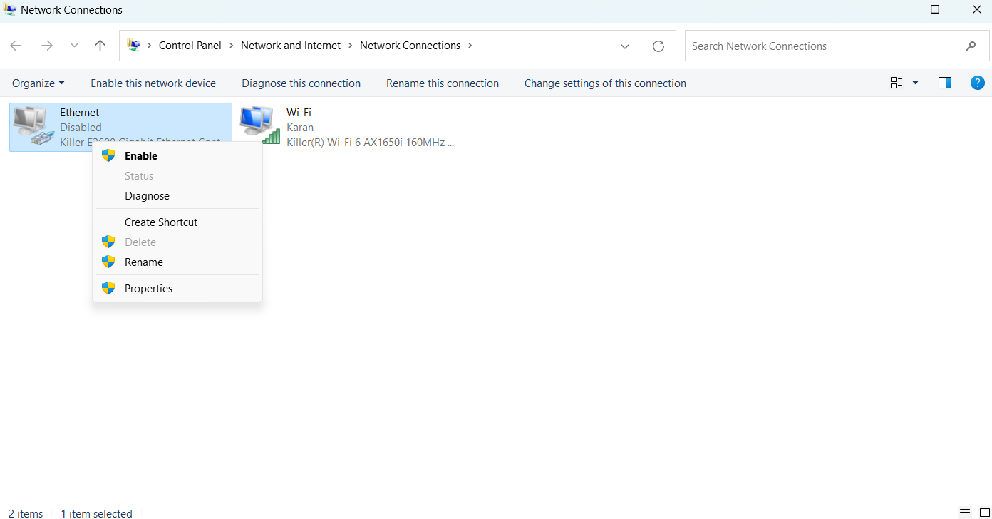 - ЯкщоEthernetадаптер сірого кольору, клацніть його правою кнопкою миші та натиснітьУвімкнути.