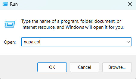 - Потім введіть команду ncpa.cpl і натиснітьВведіть.