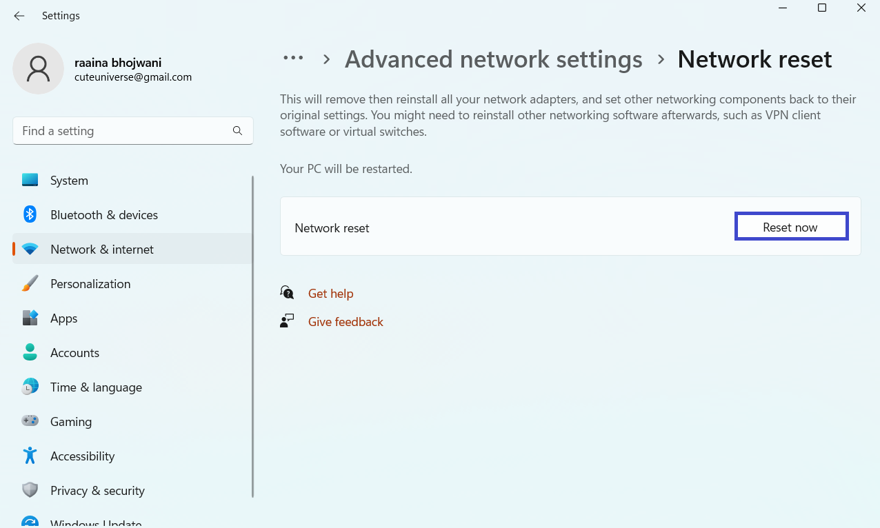 Виправлення 4: скидання налаштувань мережі, якщо Windows 11 Ethernet не працює