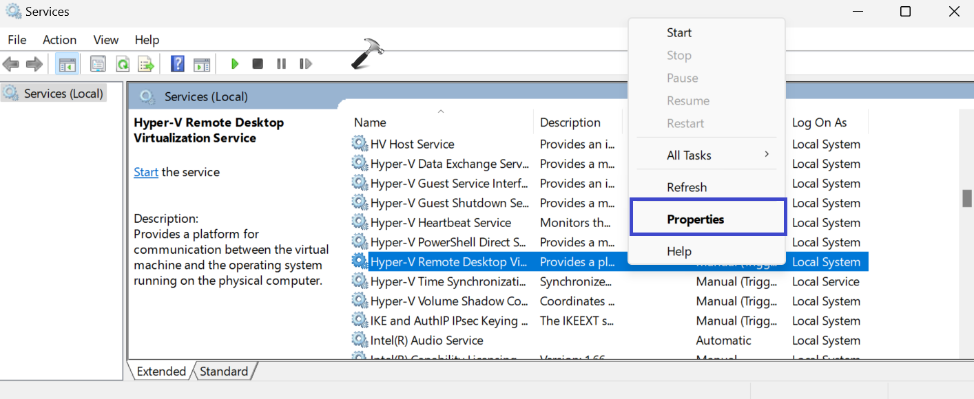 2. Клацніть правою кнопкою миші на «Служба віртуалізації віддаленого робочого столу Hyper-V" і виберіть "Властивості”.