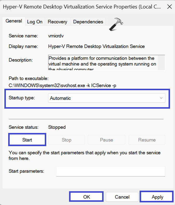 3. Зробіть тип запуску "Автоматично»а потім натисніть «старт”.
