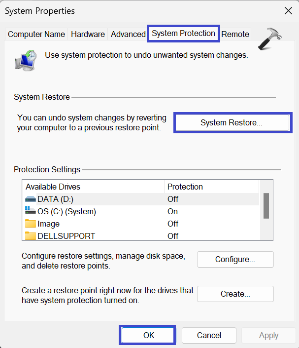 2. ПідЗахист системина вкладці «Відновлення системи” Натисніть Далі.