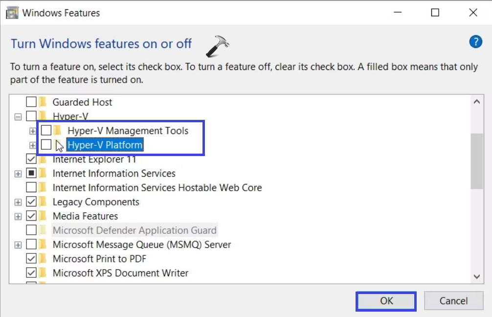 3. Зніміть позначку «Інструменти керування Hyper-V”і "Платформа Hyper-V” параметри.