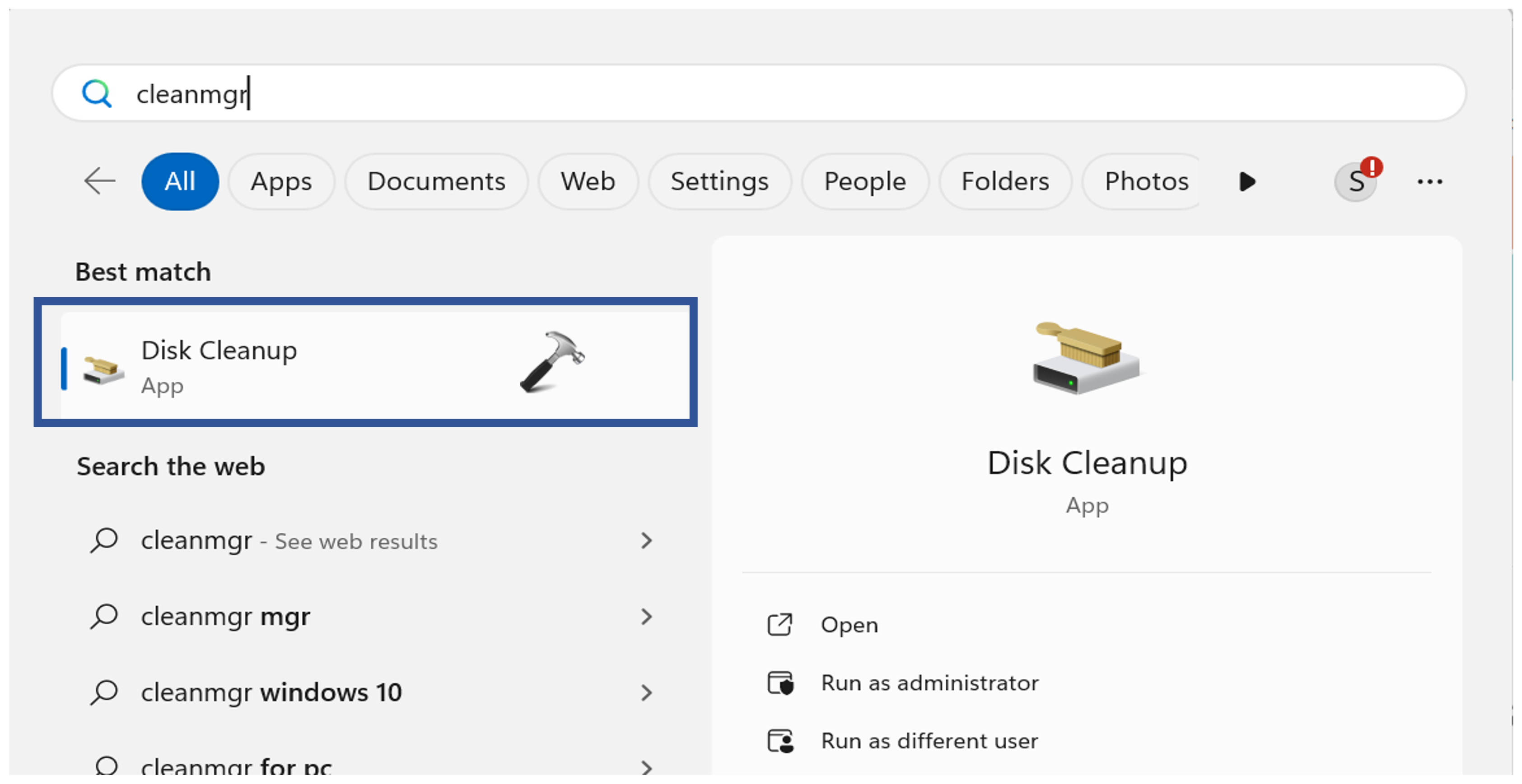 1. Відкрийте вікно пошуку та введіть "cleanmgrНатисніть "Введіть“.