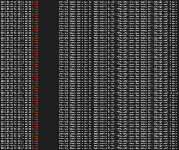 Тим часом, якщо ви запустили «pmset -g log|grep -e ” Sleep ” -e ” Wake “, ви могли помітити, що сплячий режим обслуговування може заважати сну вашого ноутбука, і ви можете побачити TCPKeepAlive=Active. Журнал, який ми маємо на увазі, може виглядати так: