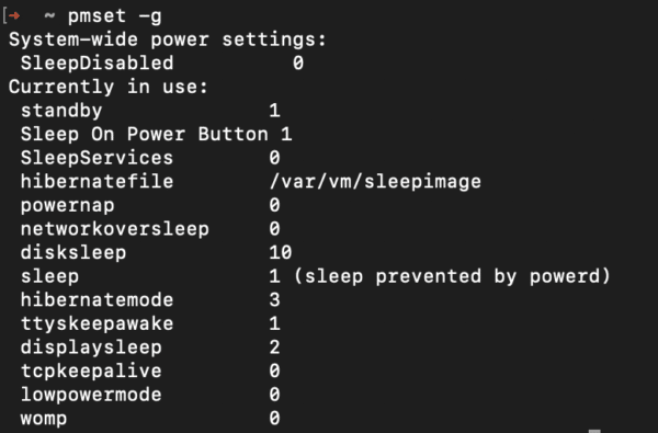 Нарешті, ви також можете переглянути налаштування Mac (файли). Якщо ви запустили «sudo pmset -g», ви могли побачити щось подібне до цього: