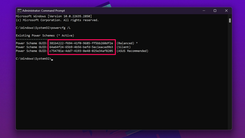 powercfg /L3.Це будепоказати всі схеми живленняна вашому ноутбуці з Windows 11 з унікальнимиGUID схеми живленнядля кожного з них.