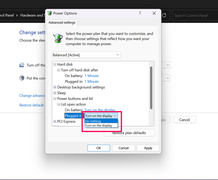 7.Після того, як ви запустите команду для відкриття кришки, використовуючи GUID вибраного плану живлення,зміна вплине лише на конкретний план живленняна вашому ноутбуці з Windows 11.