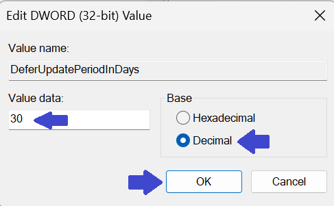 Клацніть DeferUpdatePeriodInDays і виберіть основу як Decimal. Встановіть значення від 0 до 30 і натисніть OK.