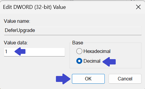 Тепер натисніть DeferUpgrade і виберіть основу як Decimal. Встановіть значення 1 і натисніть OK.