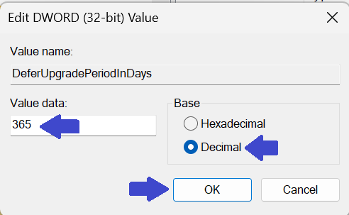 Клацніть DeferUpgradePeriodInDays і виберіть десяткову базу. Встановіть значення від 0 до 365 і натисніть OK.